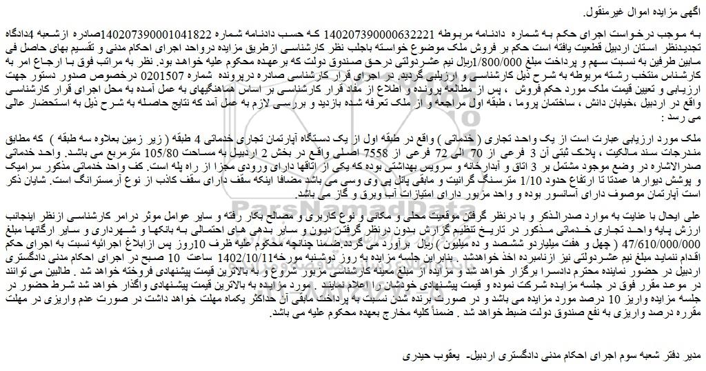 علی ایحال با عنایت به موارد صدرالذکر و با درنظر گرفتن موقعیت محلی و مکانی و نوع کاربری و مصالح بکار رفته و سایر عوامل موثر درامر کارشناسی ازنظر اینجانب ارزش پایه واحد تجاری خدماتی مذکور در تاریخ تنظیم گزارش بدون درنظر گرفتن دیون و سایر بدهی های احتمالی به بانکها و شهرداری و سایر ارگانها مبلغ 47/610/000/000 ( چهل و هفت میلیاردو ششصد و ده میلیون ) ریال  برآورد می گردد.ضمنا چنانچه محکوم علیه ظرف 10روز پس ازابلاغ اجرائیه نسبت به اجرای حکم اقدام ننماید مبلغ نیم عشردولتی نیز ازنامبرده اخذ خواهدشد . بنابراین جلسه مزایده به روز دوشنبه مورخه1402/10/11 ساعت  10 صبح در اجرای احکام مدنی دادگستری اردبیل در حضور نماینده محترم دادسرا برگزار خواهد شد و مزایده از مبلغ معینه کارشناسی مزبور شروع و به بالاترین قیمت پیشنهادی فروخته خواهد شد . طالبین می توانند در موعد مقرر فوق در جلسه مزایده شرکت نموده و قیمت پیشنهادی خودشان را اعلام نمایند . مورد مزایده به بالاترین قیمت پیشنهادی واگذار خواهد شد شرط حضور در جلسه مزایده واریز 10 درصد مورد مزایده می باشد و در صورت برنده شدن نسبت به پرداخت مابقی آن حداکثر یکماه مهلت خواهد داشت در صورت عدم واریزی در مهلت مقرره درصد واریزی به نفع صندوق دولت ضبط خواهد شد . ضمناً کلیه مخارج بعهده محکوم علیه می باشد.