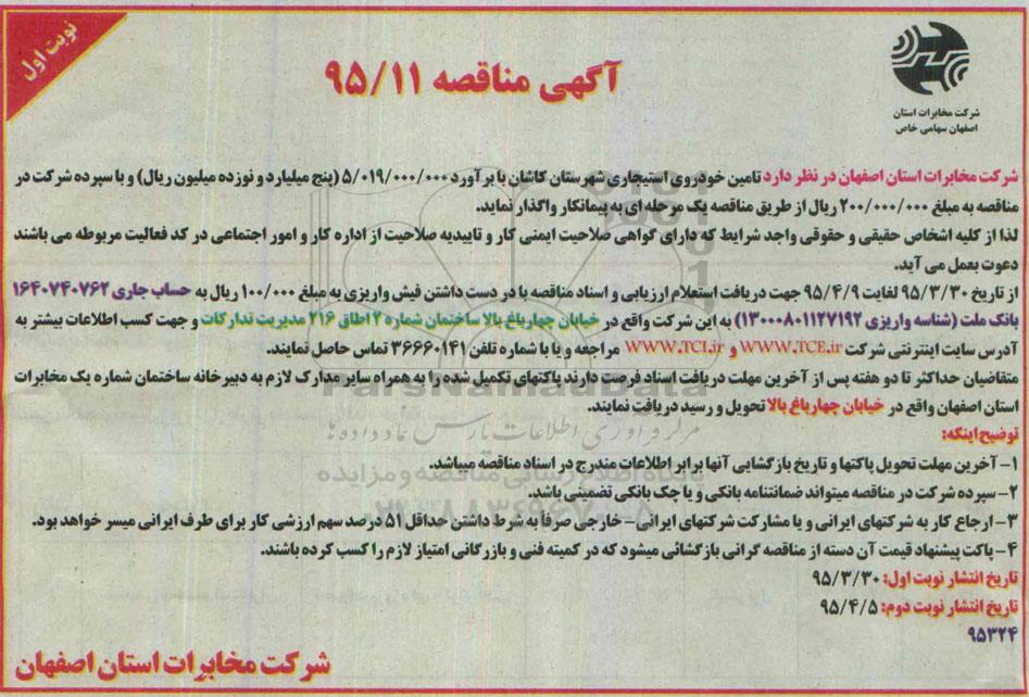 شرکت مخابرات استان اصفهان در نظر دارد تامین خودروی استیجاری شهرستان کاشان با برآورد 5.019.000.000 پنج میلیارد و نوزده میلیون ریال و با سپرده شرکت در مناقصه به مبلغ 200.000.000 ریال از طریق مناقصه یک مرحله ای به پیمانکار واگذار نماید.