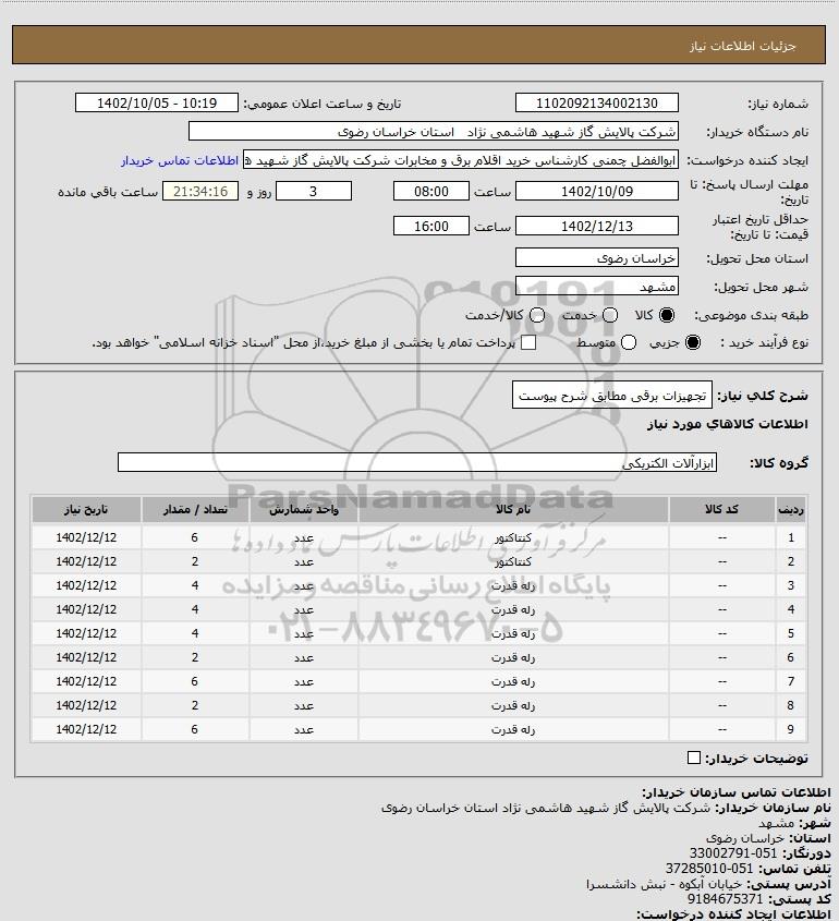 نام دستگاه خریدار:شرکت پالایش گاز شهید هاشمی نژاد استان خراسان رضوی