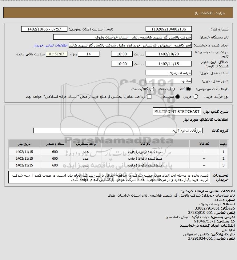 نام دستگاه خریدار:شرکت پالایش گاز شهید هاشمی نژاد استان خراسان رضوی