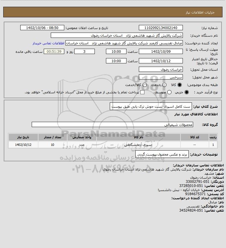 نام دستگاه خریدار:شرکت پالایش گاز شهید هاشمی نژاد استان خراسان رضوی