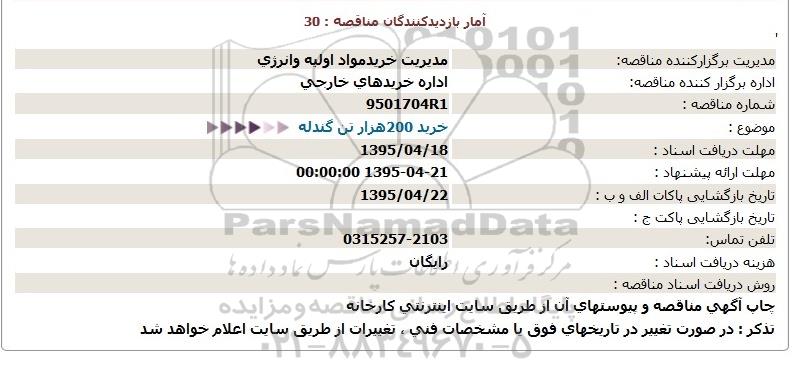 مناقصه خرید 200 هزار تن گندله از کلیه افراد متخصص و شرکتها واجد شرایط دعوت به عمل میآید در مناقصه با کد خبرگزاری پارس نماد: 682297 شرکت نمایند.