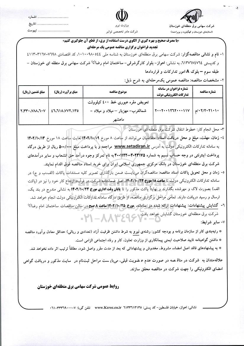 | 2021010/ 02 / م | 2002001262000117 | تعویض مقره عبوری خط 400 کیلوولت شمالغرب -مهزیار - میلاد و میلاد -ماهشهر | 46.615.772.135 | 2.330.788.607 |