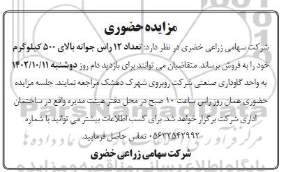 شرکت سهامی زراعی خضری در نظر دارد تعداد 12 راس جوانه بالای 500 کیلوگرم، خود را به فروش برساند. متقاضیان خرید دام سنگین  می توانند برای بازدید روز 2شنبه 1402.10.11 به واحد گاوداری صنعتی شرکت روبروی شهرک دهشک مراجعه نمایند.