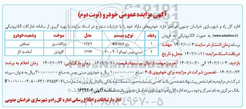 اداره کل راه و شهرسازی خراسان جنوبی در نظر دارد خودروهای مازا خود را با جزئیات مندرج در اسناد مزایده با بهره گیری از سامانه تدارکات الکترونیکی دولت ستاد ایران بصورت الکترونیکی به فروش برساند.