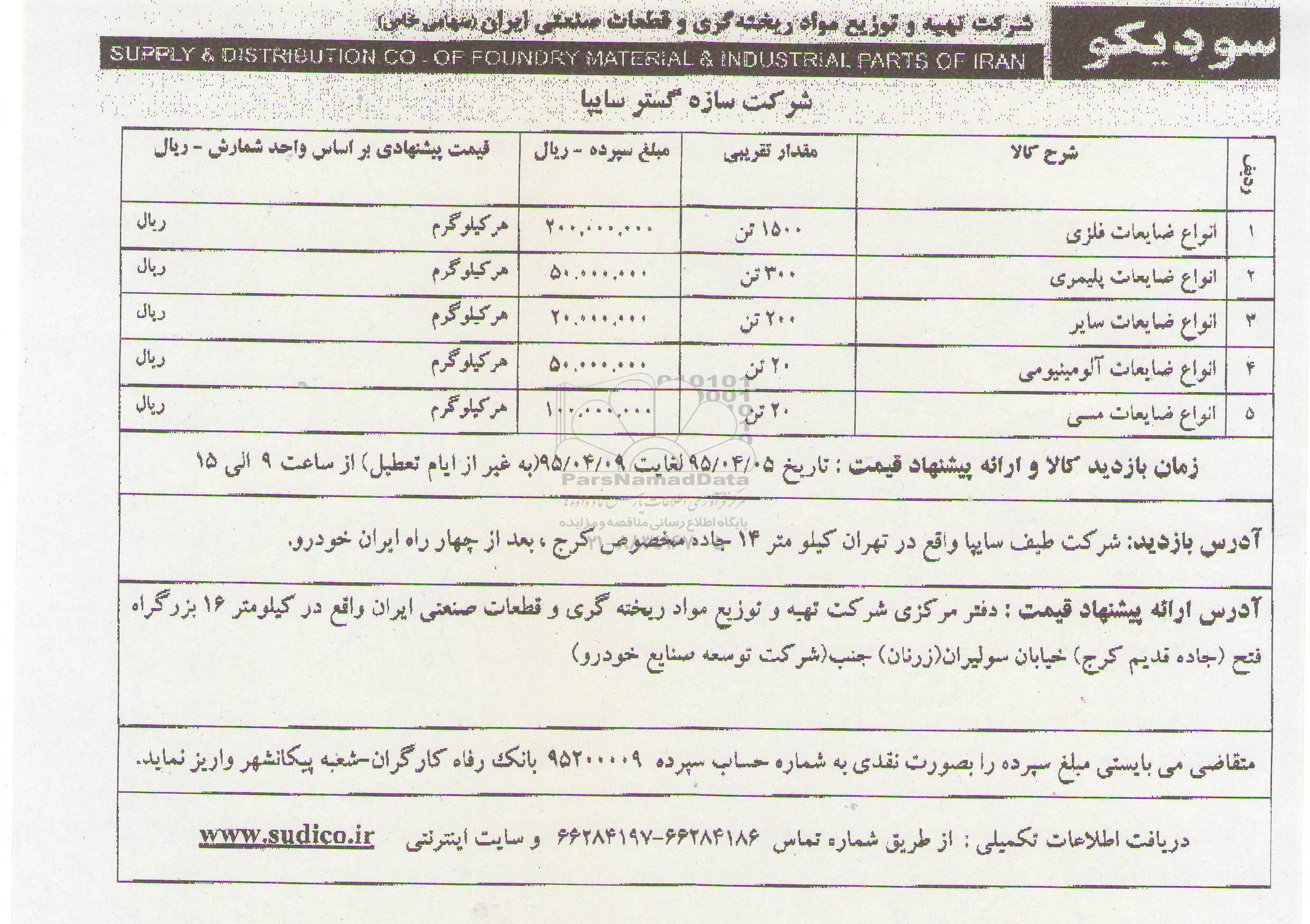 مزایده عمومی مزایده انواع ضایعات فلزی برگزار میگردد. از کلیه افراد متخصص و شرکتهای واجد شرایط دعوت به عمل میآید تا در این مزایده با کد خبرگزاری پارس نماد : 682887 شرکت نمایند تاریخ شروع مزایده : 1395/03/31 مهلت شرکت در مزایده: تا پایان روز 1395/04/09 مکان برگزاری اموال واگذاری استانهای سایر و دستهبندیهای مربوط به این حراجی آلومینیوم و پروفیل PVC, آهن آلات, قطعات مس و برنج, متفرقه میباشد.