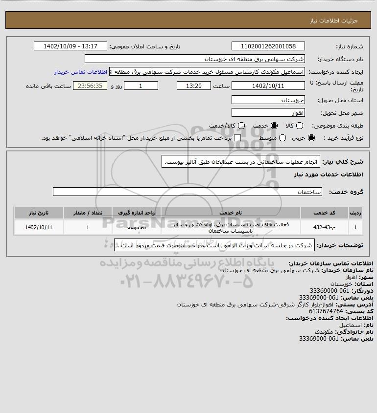 شرح کلی نیاز: انجام عملیات ساختمانی در پست عبدالخان طبق آنالیز پیوست.