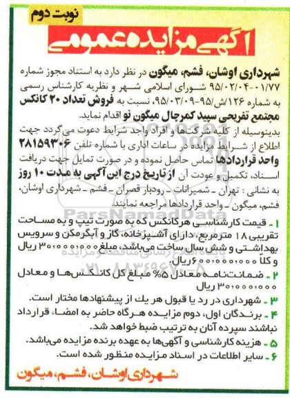 مزایده عمومی مزایده فروش تعداد 20 کانکس مجتمع - نوبت دوم برگزار میگردد. از کلیه افراد متخصص و شرکتهای واجد شرایط دعوت به عمل میآید تا در این مزایده با کد خبرگزاری پارس نماد : 684031 شرکت نمایند تاریخ شروع مزایده : 1395/04/02 مهلت شرکت در مزایده: تا پایان روز 1395/04/12 مکان برگزاری اموال واگذاری استانهای تهران و دستهبندیهای مربوط به این حراجی کانکس میباشد.