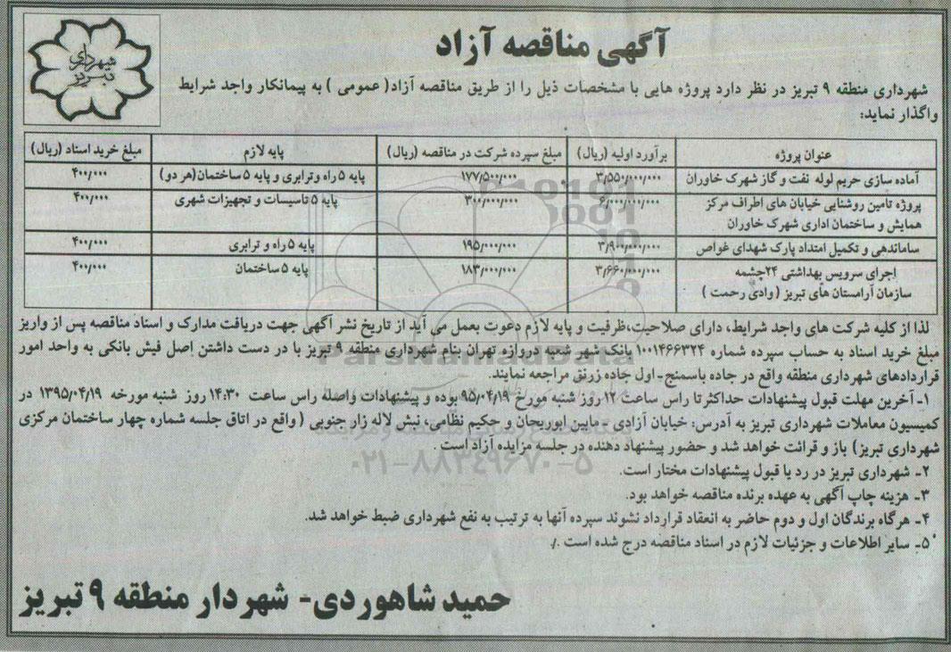 شهرداری منطقه 9 تبریز در نظر دارد پروژه هایی با مشخصات ذیل را از طریق مناقصه آزاد (عمومی) به پیمانکار واجد شرایط واگذار نماید