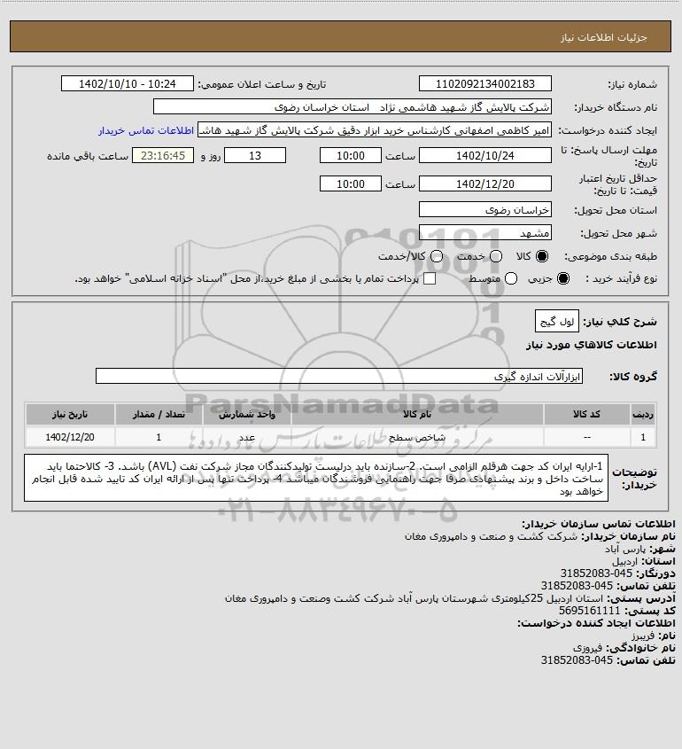 نام دستگاه خریدار:شرکت پالایش گاز شهید هاشمی نژاد استان خراسان رضوی