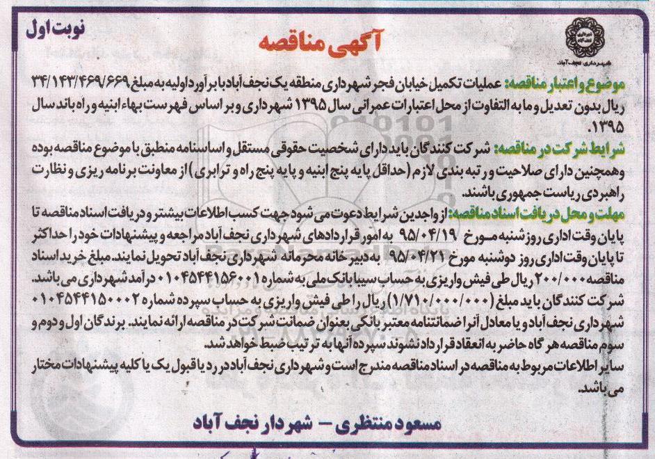 موضوع و اعتبار مناقصه: عملیات تکمیل خیابان فجر شهرداری منطقه یک نجف آباد با برآورد اولیه به مبلغ 34.143.469.669 ریال بدون تعدیل و مابه التفاوت از محل اعتبارات عمرانی سال 1395 شهرداری و بر اساس فهرست بهاء ابنیه و راه باند سال 1395