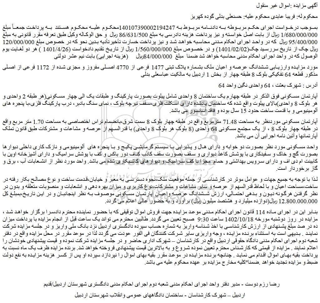 مورد مزایده وارزیابی ششدانگ عرصه و اعیان ملک بشماره پلاک ثبتی 1477 فرعی از 4770 اصلی مفروز و مجزی شده از 1172 فرعی از اصلی مذکور قطعه 64 تفکیکی بلوک 8 طبقه چهار از بخش 1 اردبیل به مالکیت عباسعلی بدلی