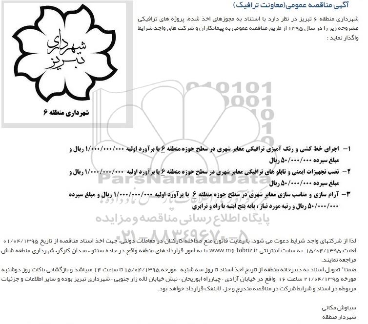 شهرداری منطقه 6 تبریز در نظر دارد پروژه های ترافیکی مشروحه زیر را در سال 1395 از طریق مناقصه عمومی به پیمانکاران و شرکت های واجد شرایط واگذار نماید:
