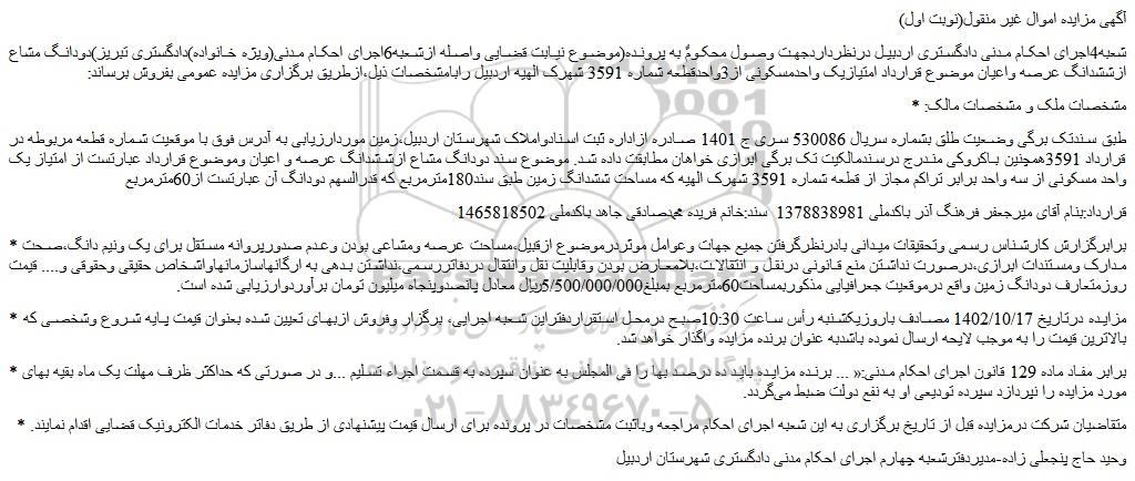 شعبه4اجرای احکام مدنی دادگستری اردبیل درنظرداردجهت وصول محکومٌ به پرونده(موضوع نیابت قضایی واصله ازشعبه6اجرای احکام مدنی(ویژه خانواده)دادگستری تبریز)دودانگ مشاع ازششدانگ عرصه واعیان موضوع قرارداد امتیازیک واحدمسکونی از3واحدقطعه شماره 3591 شهرک الهیه اردبیل رابامشخصات ذیل،ازطریق برگزاری مزایده عمومی بفروش برساند: