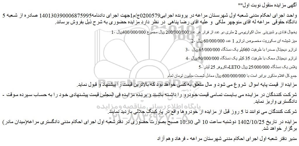 مزایده در تاریخ 1402/10/25 دوشنبه ساعت 10 الی 10:30 صبح بصورت حضوری در دفترشعبه اول اجرای احکام مدنی دادگستری مراغه(میدان مادر) برگزار خواهد شد.