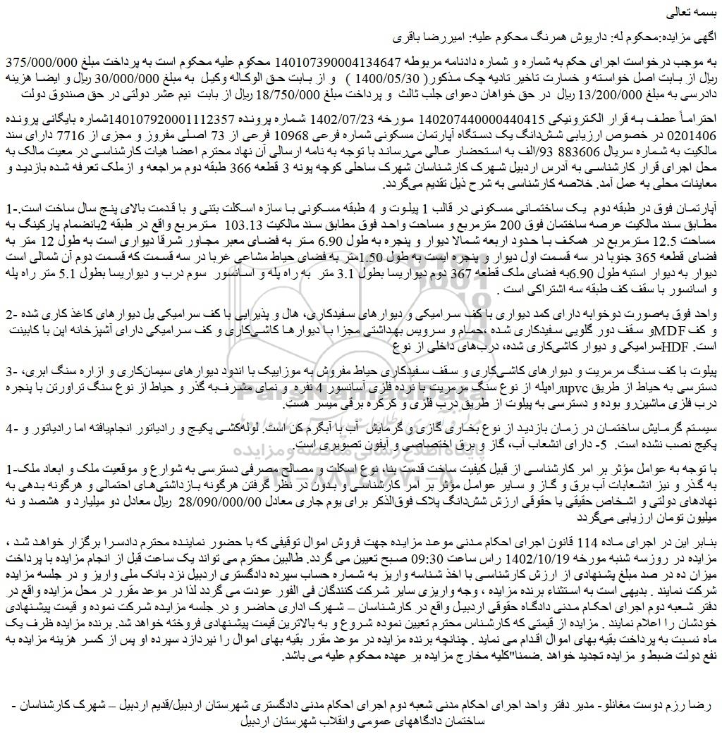 اگهی مزایده:محکوم له: داریوش همرنگ محکوم علیه: امیررضا باقری