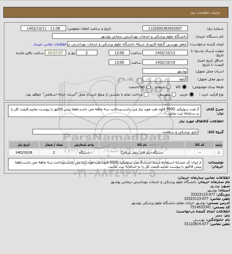 توضیحات خریدار:از ایران کد مشابه استفاده شده است.2 عدد سونیکید 500D فنون طب مورد نیاز می باشد.پرداخت سه ماهه می باشد.لطفا پیش فاکتور را پیوست نمایید.قیمت کل را در سامانه ثبت نمایید.