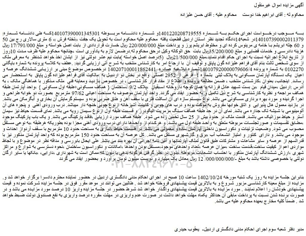 .بنابراین جلسه مزایده به روز یک شنبه مورخه 1402/10/24 ساعت 10 صبح در اجرای احکام مدنی دادگستری اردبیل در حضور نماینده محترم دادسرا برگزار خواهد شد و مزایده از مبلغ معینه کارشناسی مزبور شروع و به بالاترین قیمت پیشنهادی فروخته خواهد شد . طالبین می توانند در موعد مقرر فوق در جلسه مزایده شرکت نموده و قیمت پیشنهادی خودشان را اعلام نمایند . مورد مزایده به بالاترین قیمت پیشنهادی واگذار خواهد شد شرط حضور در جلسه مزایده واریز 10 درصد مورد مزایده می باشد و در صورت برنده شدن نسبت به پرداخت مابقی آن حداکثر یکماه مهلت خواهد داشت در صورت عدم واریزی در مهلت مقرره درصد واریزی به نفع صندوق دولت ضبط خواهد شد . ضمناً کلیه مخارج بعهده محکوم علیه می باشد.