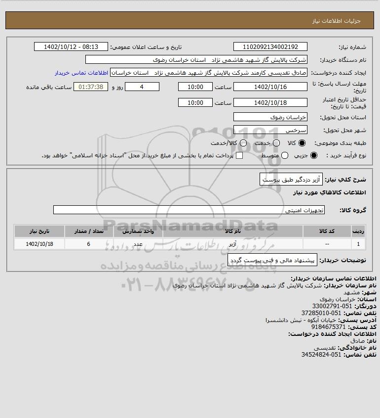 نام دستگاه خریدار:شرکت پالایش گاز شهید هاشمی نژاد استان خراسان رضوی