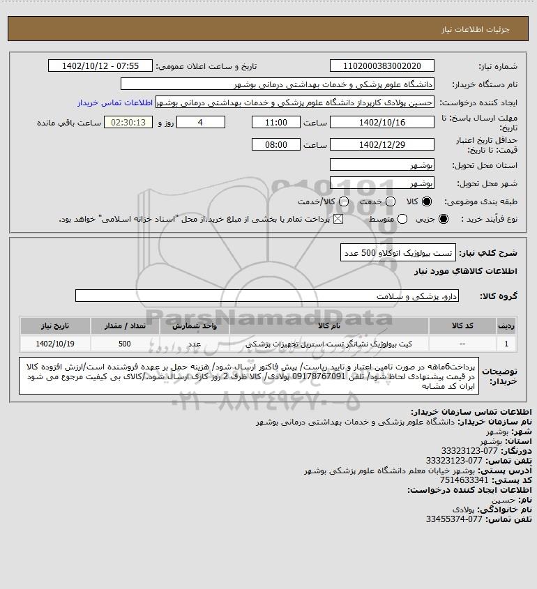 شرح کلی نیاز: تست بیولوژیک اتوکلاو 500 عدد