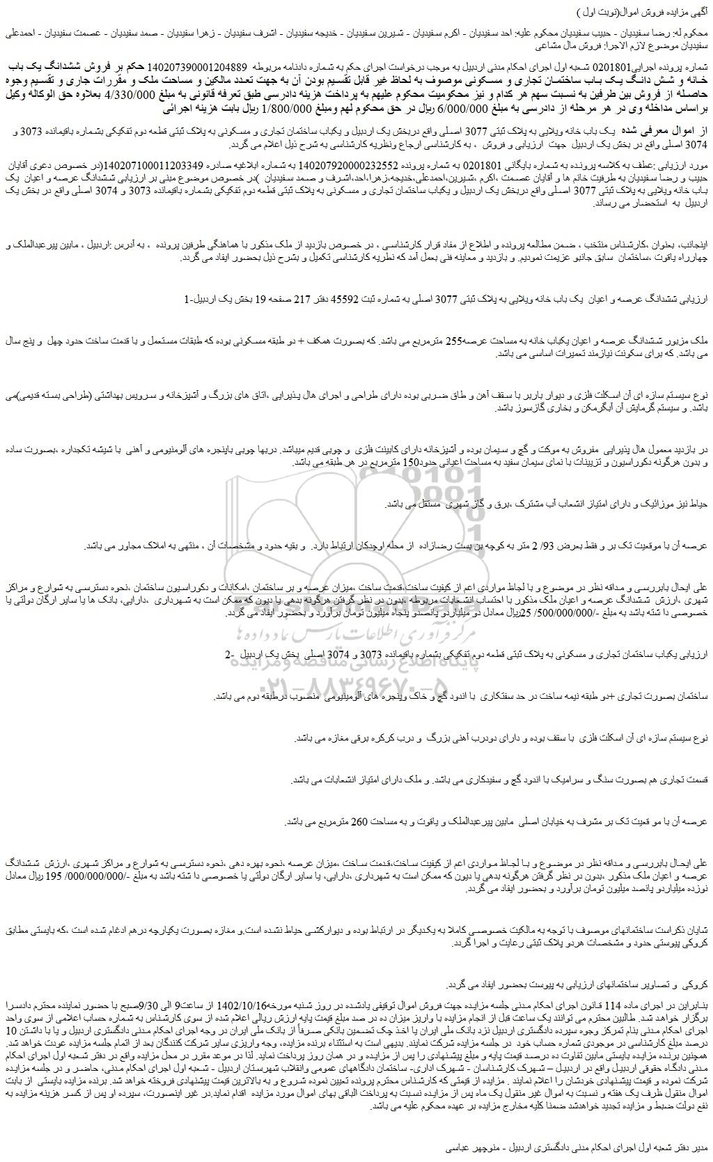 مورد ارزیابی :عطف به کلاسه پرونده به شماره بایگانی 0201801 به شماره پرونده 140207920000232552 به شماره ابلاغیه صادره 140207100011203349(در خصوص دعوی آقایان حبیب و رضا سفیدیان به طرفیت خانم ها و آقایان عصمت ،اکرم ،شیرین،احمدعلی،خدیجه،زهرا،احد،اشرف و صمد سفیدیان  )در خصوص موضوع مبنی بر ارزیابی ششدانگ عرصه و اعیان  یک باب خانه ویلایی به پلاک ثبتی 3077 اصلی واقع دربخش یک اردبیل و یکباب ساختمان تجاری و مسکونی به پلاک ثبتی قطعه دوم تفکیکی بشماره باقیمانده 3073 و 3074 اصلی واقع در بخش یک اردبیل  به  استحضار می رساند.