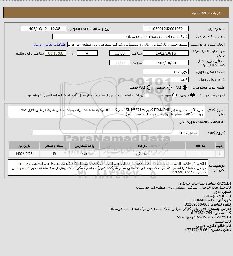 شرح کلی نیاز: خرید 19 عدد پرده زبراDIAMOND کدپرده:SNJ:5271 کد رنگ : 101وکلیه متعلقات برای پست اصلی شوشتر طبق فایل های پیوست(کالای مغایر با درخواست پذیرفته نمی شود)