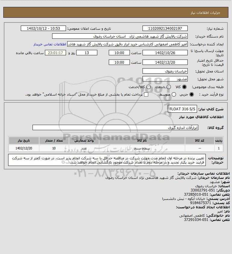 نام دستگاه خریدار:شرکت پالایش گاز شهید هاشمی نژاد استان خراسان رضوی