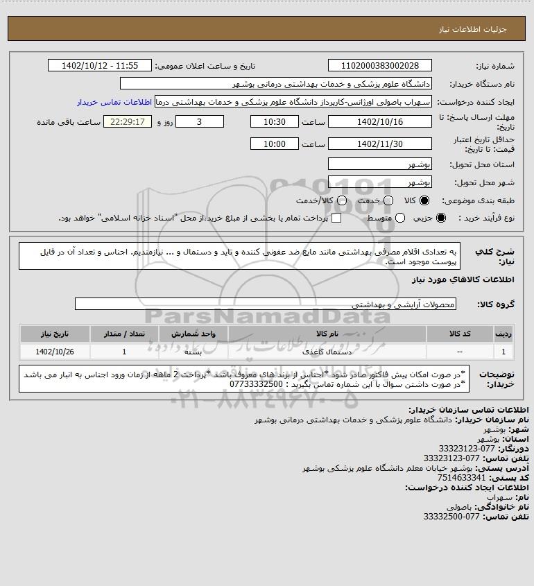 نام دستگاه خریدار:دانشگاه علوم پزشکی و خدمات بهداشتی درمانی بوشهر