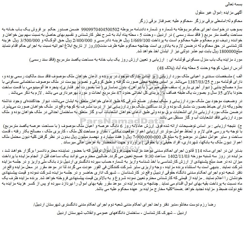 بموجب درخواست اجرای حکم مربوطه به شماره و شماره دادنامه مربوطه 9909970404500502 ضمن صدور حکم بر فروش یک باب خانه به مساحت یکصد متر مربع ( فاقد سند رسمی ) در اردبیل ، وحدت 5 ، محله پناه آباد به شرح نظر کارشناس و تقسیم بهای حاصل به نسبت سهم بین خواهان و خوانده ردیف دوم محکوم علیه محکوم است به پرداخت 1/669/100 ریال هزینه دادرسی و 2/400/000 ریال حق الوکاله و 3/500/000 ریال هزینه کارشناسی در حق محکوم له درضمن لازم به یاداوری است چنانچه محکوم علیه ظرف مدت10روز از تاریخ ابلاغ اجرائیه نسبت به اجرای حکم اقدام ننماید مبلغ1800000 ریال بابت نیم عشر دولتی نیز از ایشان اخذ خواهد شد.