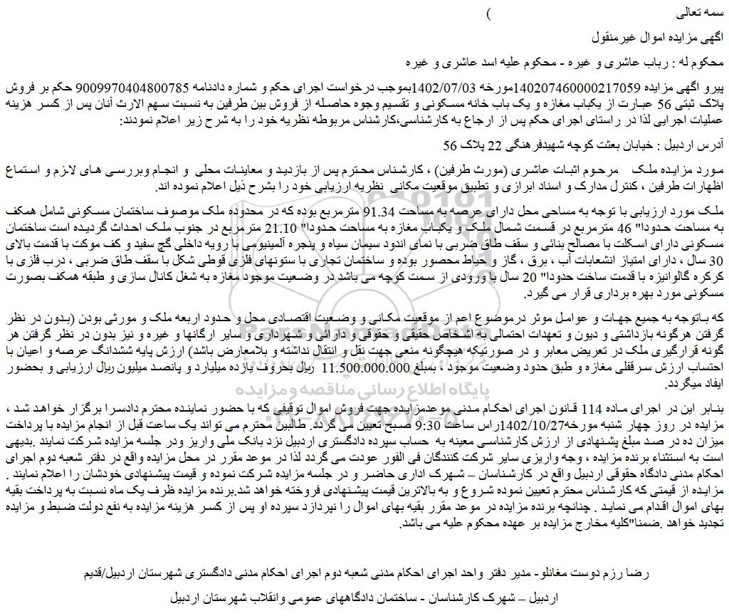 پیرو اگهی مزایده 140207460000217059مورخه 1402/07/03بموجب درخواست اجرای حکم و شماره دادنامه 9009970404800785 حکم بر فروش پلاک ثبتی 56 عبارت از یکباب مغازه و یک باب خانه مسکونی و تقسیم وجوه حاصله از فروش بین طرفین به نسبت سهم الارث آنان پس از کسر هزینه عملیات اجرایی لذا در راستای اجرای حکم پس از ارجاع به کارشناسی،کارشناس مربوطه نظریه خود را به شرح زیر اعلام نمودند: