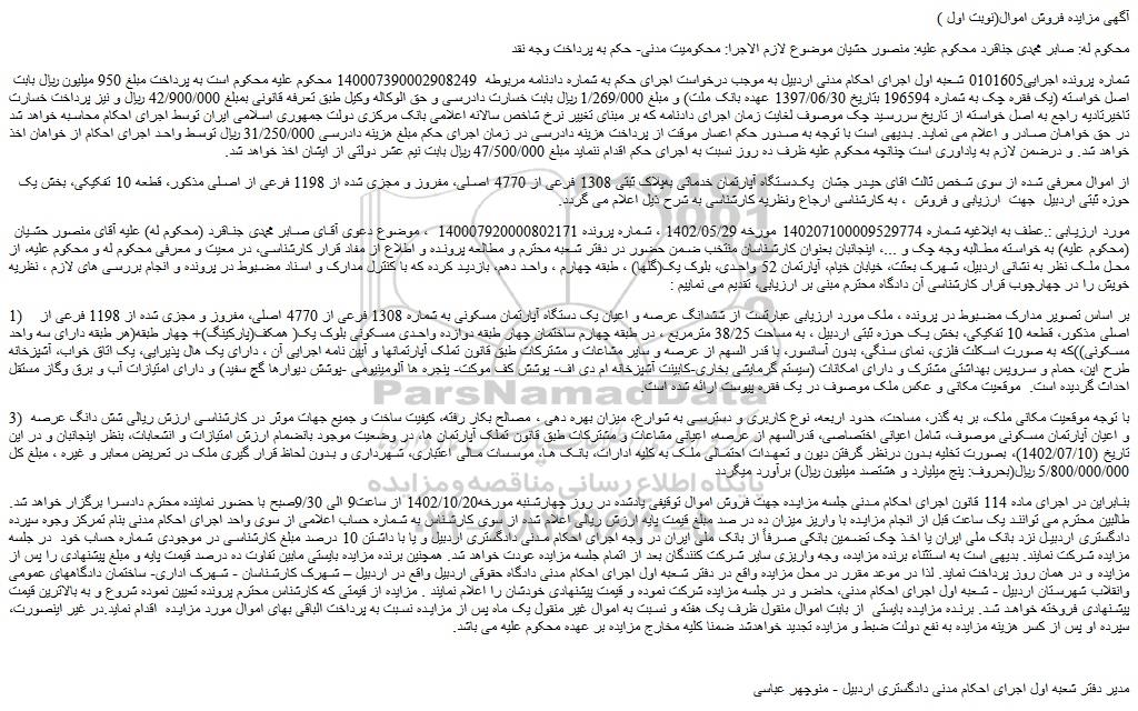 مورد ارزیابی :.عطف به ابلاغیه شماره 140207100009529774 مورخه 1402/05/29 ، شماره پرونده 140007920000802171  ، موضوع دعوی آقای صابر محمدی جناقرد (محکوم له) علیه آقای منصور حشیان (محکوم علیه) به خواسته مطالبه وجه چک و ...، اینجانبان بعنوان کارشناسان منتخب ضمن حضور در دفتر شعبه محترم و مطالعه پرونده و اطلاع از مفاد قرار کارشناسی، در معیت و معرفی محکوم له و محکوم علیه، از محل ملک نظر به نشانی اردبیل، شهرک بعثت، خیابان خیام، آپارتمان 52 واحدی، بلوک یک(گلها) ، طبقه چهارم ، واحد دهم، بازدید کرده که با کنترل مدارک و اسناد مضبوط در پرونده و انجام بررسی های لازم ، نظریه خویش را در چهارچوب قرار کارشناسی آن دادگاه محترم مبنی بر ارزیابی، تقدیم می نماییم :