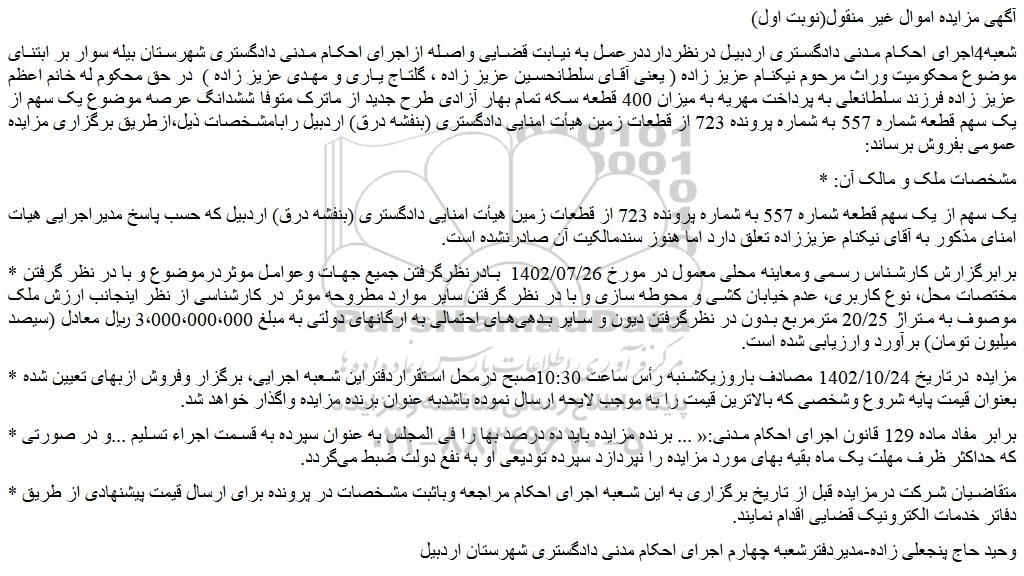 شعبه4اجرای احکام مدنی دادگستری اردبیل درنظردارددرعمل به نیابت قضایی واصله ازاجرای احکام مدنی دادگستری شهرستان بیله سوار بر ابتنای موضوع محکومیت وراث مرحوم نیکنام عزیز زاده ( یعنی آقای سلطانحسین عزیز زاده ، گلتاج یاری و مهدی عزیز زاده )  در حق محکوم له خانم اعظم عزیز زاده فرزند سلطانعلی به پرداخت مهریه به میزان 400 قطعه سکه تمام بهار آزادی طرح جدید از ماترک متوفا ششدانگ عرصه موضوع یک سهم از یک سهم قطعه شماره 557 به شماره پرونده 723 از قطعات زمین هیأت امنایی دادگستری (بنفشه درق) اردبیل رابامشخصات ذیل،ازطریق برگزاری مزایده عمومی بفروش برساند: