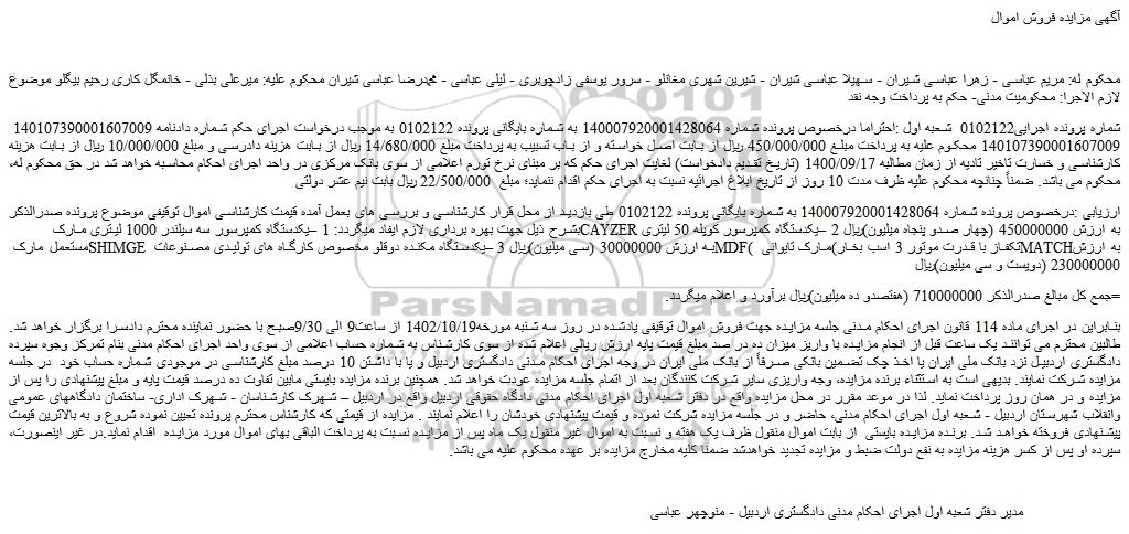 شماره پرونده اجرایی0102122 شعبه اول :احتراما درخصوص پرونده شماره 140007920001428064 به شماره بایگانی پرونده 0102122 به موجب درخواست اجرای حکم شماره دادنامه 140107390001607009 140107390001607009 محکوم علیه به پرداخت مبلغ 450/000/000 ریال از بابت اصل خواسته و از باب تسبیب به پرداخت مبلغ 14/680/000 ریال از بابت هزینه دادرسی و مبلغ 10/000/000 ریال از بابت هزینه کارشناسی و خسارت تاخیر تادیه از زمان مطالبه 1400/09/17 (تاریخ تقدیم دادخواست) لغایت اجرای حکم که بر مبنای نرخ تورم اعلامی از سوی بانک مرکزی در واحد اجرای احکام محاسبه خواهد شد در حق محکوم له، محکوم می باشد. ضمناً چنانچه محکوم علیه ظرف مدت 10 روز از تاریخ ابلاغ اجرائیه نسبت به اجرای حکم اقدام ننماید؛ مبلغ 22/500/000 ریال بابت نیم عشر دولتی