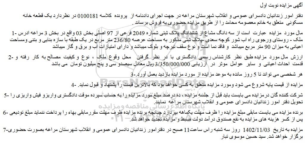1- مال مورد مزایده عبارت است از سه دانگ مشاع از ششدانگ پلاک ثبتی شماره 2049 فرعی از 97 اصلی بخش 03 واقع در بخش 3 مراغه ادرس ملک - روستای ورجوی راه اب شور کوچه سعدی -پلاک ثبتی مذکور به مساحت عرصه 236/80 متر مربع در یک طبقه با سازه بنایی و بتنی ومساحت اعیانی به میزان 90 متر مربع میباشد و فاقد نما است و نوع سقف تیرچه و بلوک میباشد و دارای امتیازات اب و برق و گاز میباشد