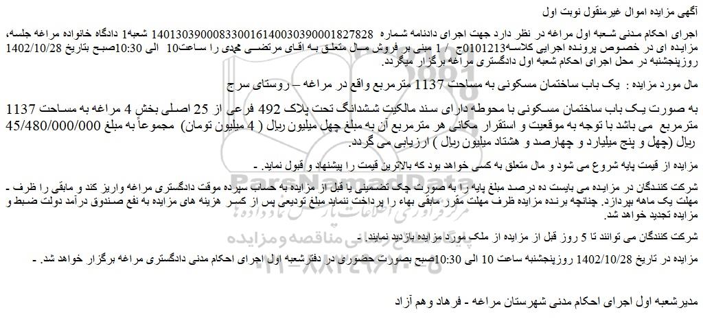- مزایده در تاریخ 1402/10/28 روزپنجشنبه ساعت 10 الی 10:30صبح بصورت حضوری در دفترشعبه اول اجرای احکام مدنی دادگستری مراغه برگزار خواهد شد.