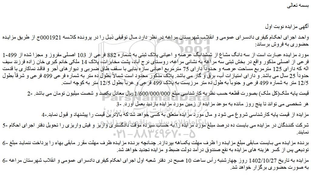 واحد اجرای احکام کیفری دادسرای عمومی و انقلاب شهرستان مراغه در نظر دارد مال توقیفی ذیل را در پرونده کلاسه 0001921ج از طریق مزایده حضوری به فروش برساند: