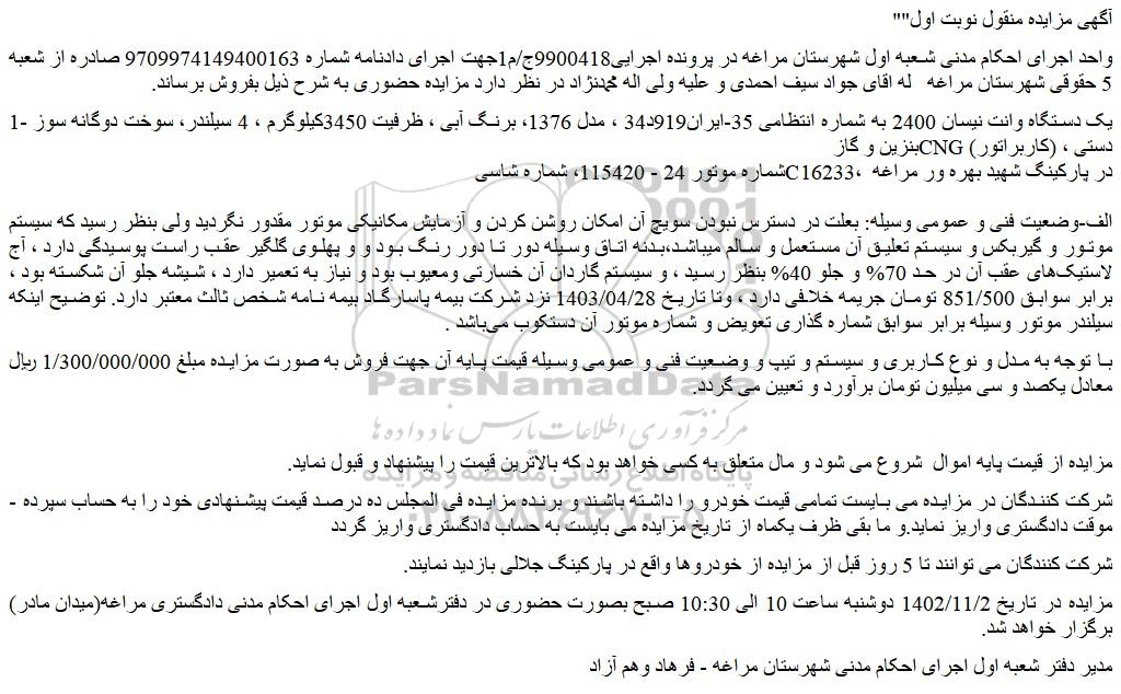 واحد اجرای احکام مدنی شعبه اول شهرستان مراغه در پرونده اجرایی9900418ج/م1جهت اجرای دادنامه شماره 9709974149400163 صادره از شعبه 5 حقوقی شهرستان مراغه له اقای جواد سیف احمدی و علیه ولی اله محمدنژاد در نظر دارد مزایده حضوری به شرح ذیل بفروش برساند.