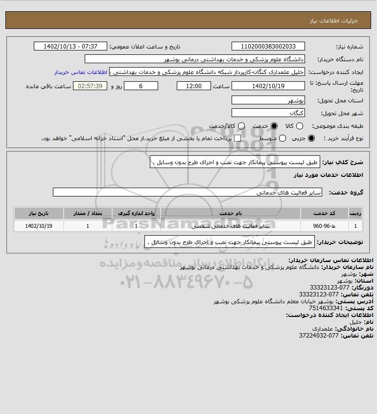 شرح کلی نیاز: طبق لیست پیوستی پیمانکار جهت نصب و اجرای طرح بدون وسایل .