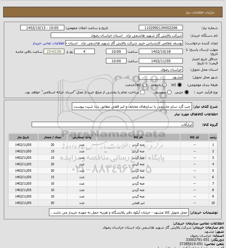 نام دستگاه خریدار:شرکت پالایش گاز شهید هاشمی نژاد استان خراسان رضوی