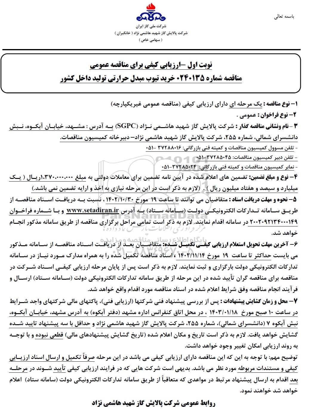 مناقصه شماره 0240135 خرید تیوب مبدل حرارتی تولید داخل کشور