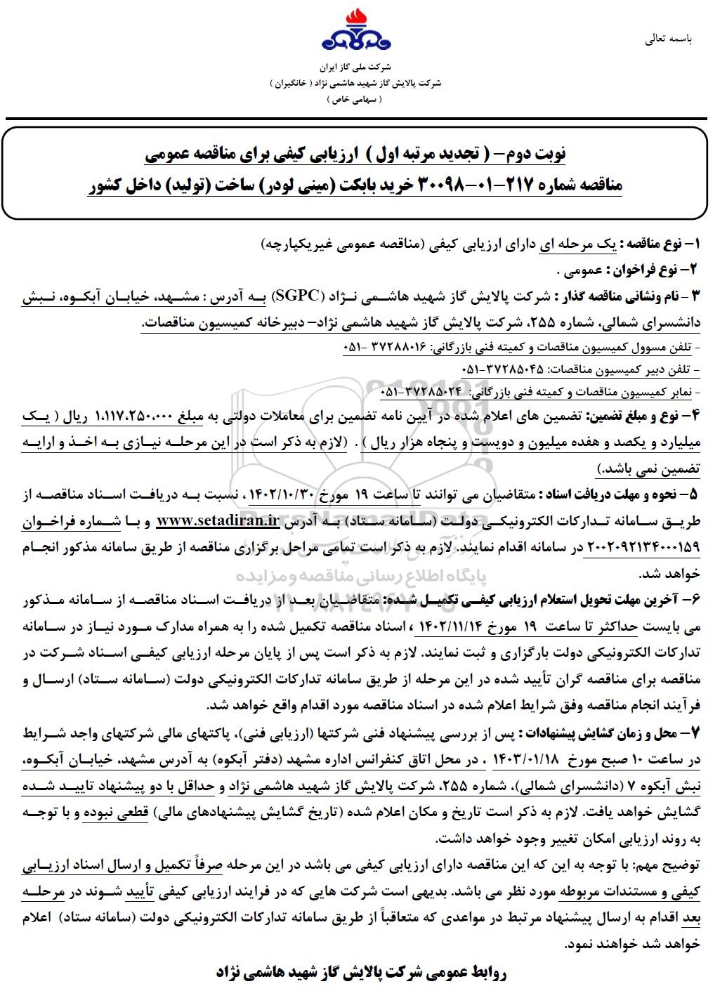 3.نام و نشانی مناقصه گزار: شرکت پالایش گاز شهید هاشمی نژاد (SGPC) به آدرس: مشهد، خیابان آبکو، نبش دانشسرای شماره 255، شرکت پالایش گاز شهید هاشمی نژاد- دبیرخانه کمیسیون مناقصات