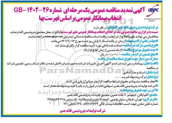 متقاضیان میتوانند جهت اطلاع از شرایط و دریافت اسناد مناقصه به نشانی اینترنتی www.gbpc.net مراجعه نمایند.