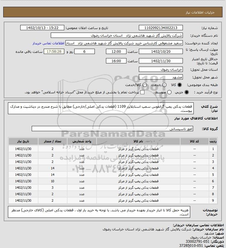 شرح کلی نیاز: قطعات یدکی پمپ گرانفوس سمپ استابلایزر 1109 (قطعات یدکی اصلی/خارجی) مطابق با شرح مندرج در دیتاشیت و مدارک پیوست.