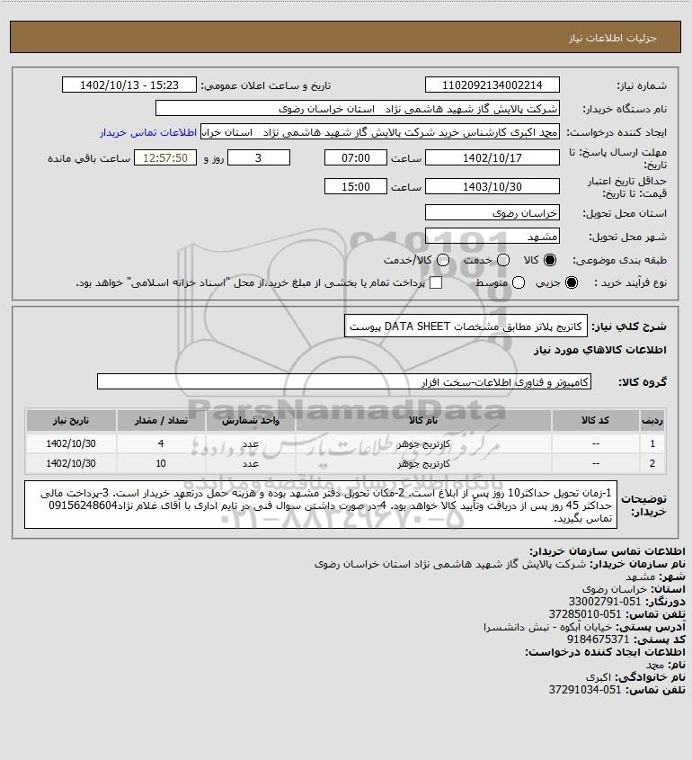 شرح کلی نیاز: کاتریج پلاتر مطابق مشخصات DATA SHEET پیوست