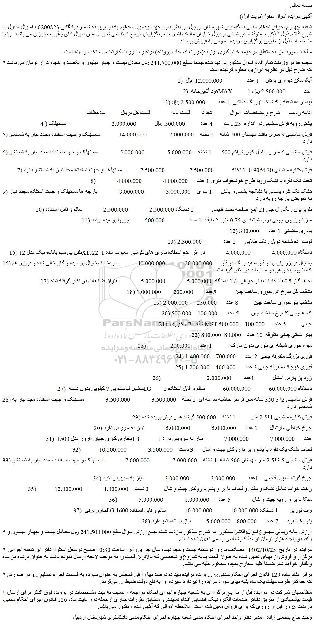 شعبه چهارم اجرای احکام مدنی دادگستری شهرستان اردبیل در نظر دارد جهت وصول محکومٌ به در پرونده شماره بایگانی 0200823 ، اموال منقول به شرح اقلام ذیل الذکر ، متوقف درنشانی اردبیل خیابان مالک اشتر حسب گزارش مرجع انتظامی تحویل امین اموال آقای یعقوب عزیزی می باشد را با مشخصات ذیل از طریق برگزاری مزایده عمومی به فروش برساند: