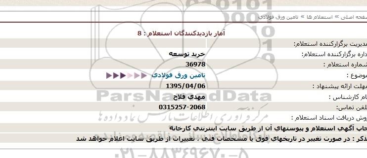 استعلام بها و موضوع استعلام استعلام,استعلام تامین ورق فولادی به اطلاع کلیه شرکتها و افراد متخصص واجد شرایط میرساند، آگهی گذار در نظر دارد از طریق استعلام بها، نسبت به انتخاب و دریافت پیشنهادات اقدام نماید. این استعلام با کد آگهی ثبت شده در سامانه خبرگزاری پارس نماد : 686263 منتشر شده است. مشخصات استعلام : تاریخ شروع استعلام: 1395/04/06 آخرین مهلت ارسال پیشنهاد قیمت : 1395/04/06 و محل اجرای پروژه : استان اصفهان میباشد. استعلام قیمت مورد درخواست : استعلام,استعلام تامین ورق فولادی با دستهبندیهای تخصصی و گروه های مرتبط : آهن آلات, انواع ورق, استعلام اطلاع رسانی میگردد.