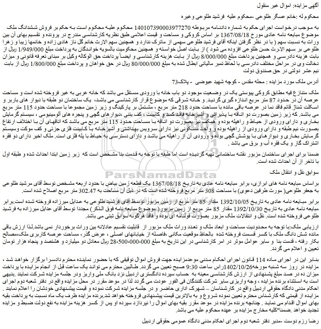 به موجب درخواست اجرای حکم به شماره دادنامه مربوطه 140107390003977270 محکوم علیه محکوم است به حکم بر فروش ششدانگ ملک موضوع مبایعه نامه عادی مورخ 1367/08/18 بر اساس کروکی و مساحت و قیمت اعلامی طبق نظریه کارشناسی مندرج در پرونده و تقسیم بهای آن بین وراث به نسبت سهم ( با در نظر گرفتن اینکه آقای فرشید طلوعی سهمی از ماترک ندارد و همچنین سهم الارث خانم گل ناز هادی زاده و خانمها زیبا و زهرا طلوعی بر سهم الارث حسن طلوعی افزوده می شود ) از بابت اصل خواسته و همچنین محکومیت بالسویه خواندگان به پرداخت مبلغ 1/949/000 ریال از بابت هزینه دادرسی و همچنین پرداخت مبلغ 8/000/000 ریال از بابت هزینه کارشناسی و ایضاً پرداخت حق الوکاله وکیل بر مبنای تعرفه قانونی و میزان دخالت وی در مراحل مختلف دادرسی با لحاظ تمبر مالیاتی ابطال شده به مبلغ 80/000/000 ریال در حق خواهان و پرداخت مبلغ 1/800/000 ریال از بابت نیم عشر دولتی در حق صندوق دولت