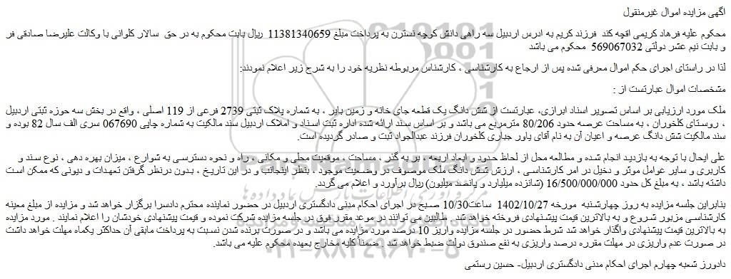 بنابراین جلسه مزایده به روز چهارشنبه  مورخه 1402/10/27  ساعت10/30 صبح در اجرای احکام مدنی دادگستری اردبیل در حضور نماینده محترم دادسرا برگزار خواهد شد و مزایده از مبلغ معینه کارشناسی مزبور شروع و به بالاترین قیمت پیشنهادی فروخته خواهد شد . طالبین می توانند در موعد مقرر فوق در جلسه مزایده شرکت نموده و قیمت پیشنهادی خودشان را اعلام نمایند . مورد مزایده به بالاترین قیمت پیشنهادی واگذار خواهد شد شرط حضور در جلسه مزایده واریز 10 درصد مورد مزایده می باشد و در صورت برنده شدن نسبت به پرداخت مابقی آن حداکثر یکماه مهلت خواهد داشت در صورت عدم واریزی در مهلت مقرره درصد واریزی به نفع صندوق دولت ضبط خواهد شد . ضمناً کلیه مخارج بعهده محکوم علیه می باشد.
