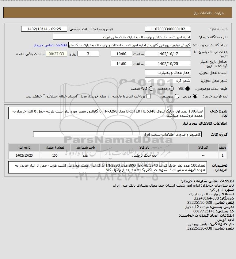 شرح کلی نیاز: تعداد100 عدد تونر چاپگر لیزری BROTER HL 5340 مدل TN-3290 با گارانتی معتبر مورد نیاز است هزینه حمل تا انبار خریدار به عهده فروشنده میباشد