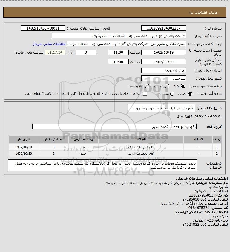 نام دستگاه خریدار:شرکت پالایش گاز شهید هاشمی نژاد استان خراسان رضوی